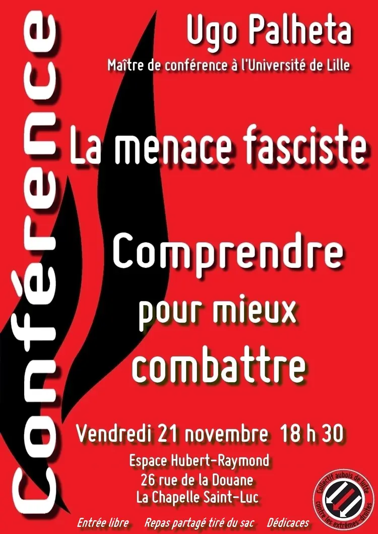 Le Collectif Aubois de lutte contre l’extrême droite dont fait partie la CGT propose une conférence le vendredi 21 novembre 2025 à 18h30 au 26 rue de la Douane à la Chapelle Saint Luc animée par Ugo Palheta.