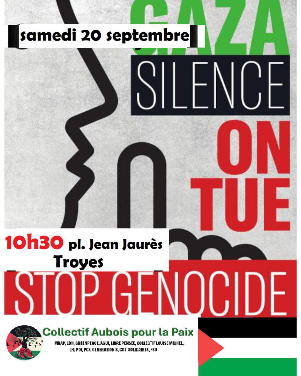 Le 20 septembre à 10h30, nous marchons à Troyes, comme dans beaucoup d'autres villes, pour la reconnaissance de l’Etat palestinien et l’arrêt immédiat du génocide en cours. Alors que l’armée israélienne vient de lancer une vaste offensive terrestre sur la ville de Gaza, des centaines de milliers de Gazaoui·es épuisé·es, affamé·es, ayant tout perdu et ne sachant pas où aller, se retrouvent jeté·es sur les routes. Rien ne semble freiner le projet colonial et suprémaciste d’Israël, qui provoque un génocide et accélère la colonisation.