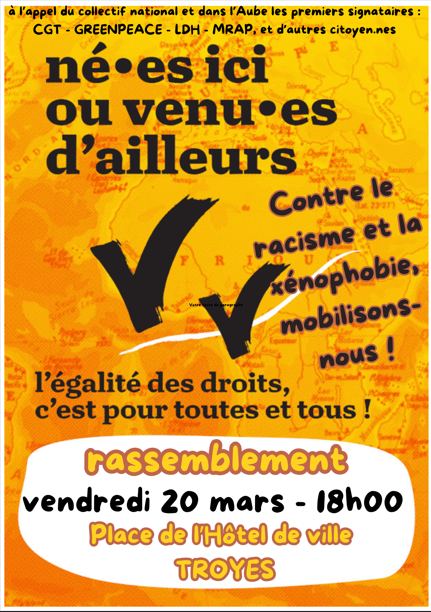 Les organisations du collectif Né-es ici ou venu-es d’ailleurs (dont la Cgt fait partie)(*), actrices de la société civile, appellent en toute indépendance vis à vis des formations politiques à une large mobilisation de la société, dans toute sa diversité, autour de la Journée internationale pour l’élimination de la discrimination raciale, partout en France.